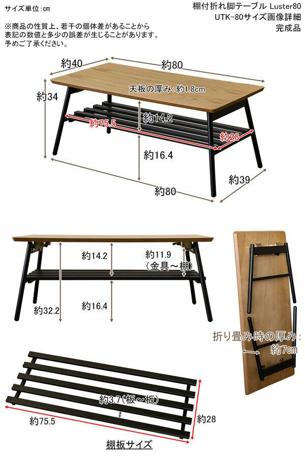 棚付き折れ脚テーブル Luster 80 ABR/OAK/WAL