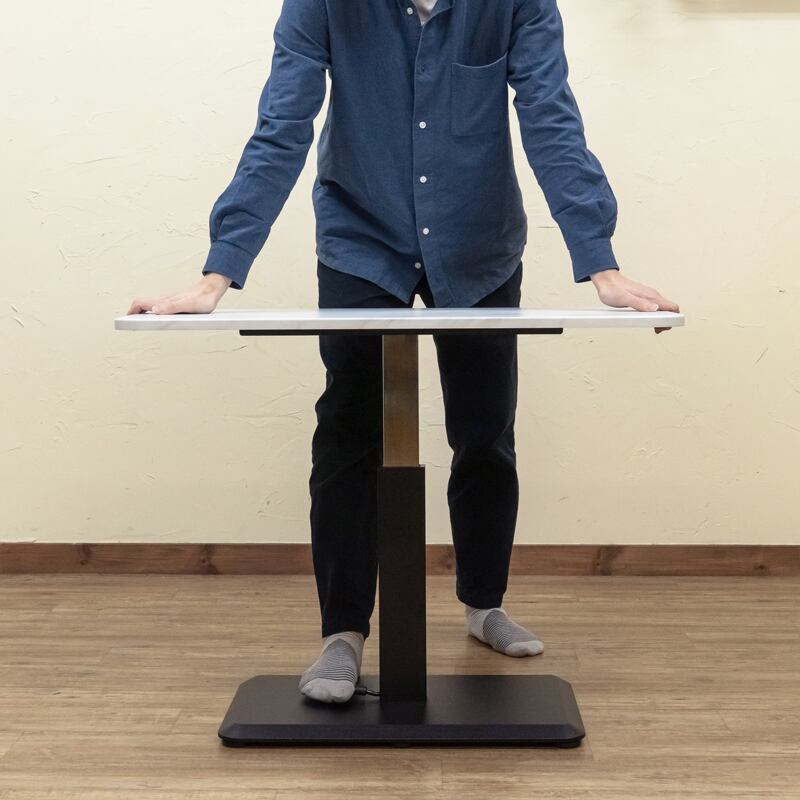 脚部のノブを踏みながら荷重を掛けると天板の昇降が出来ます